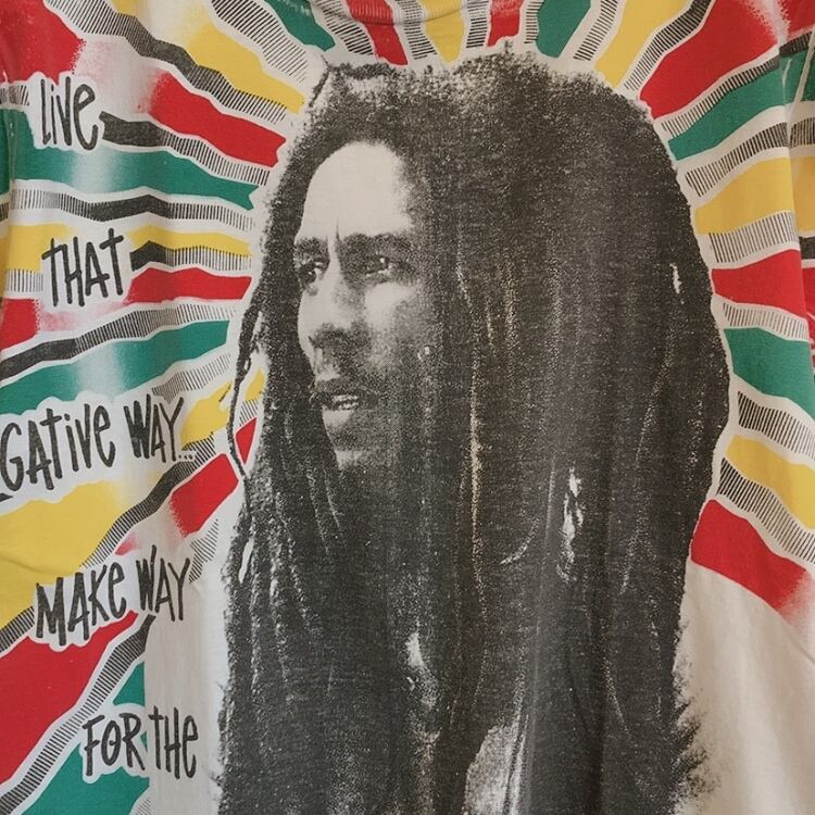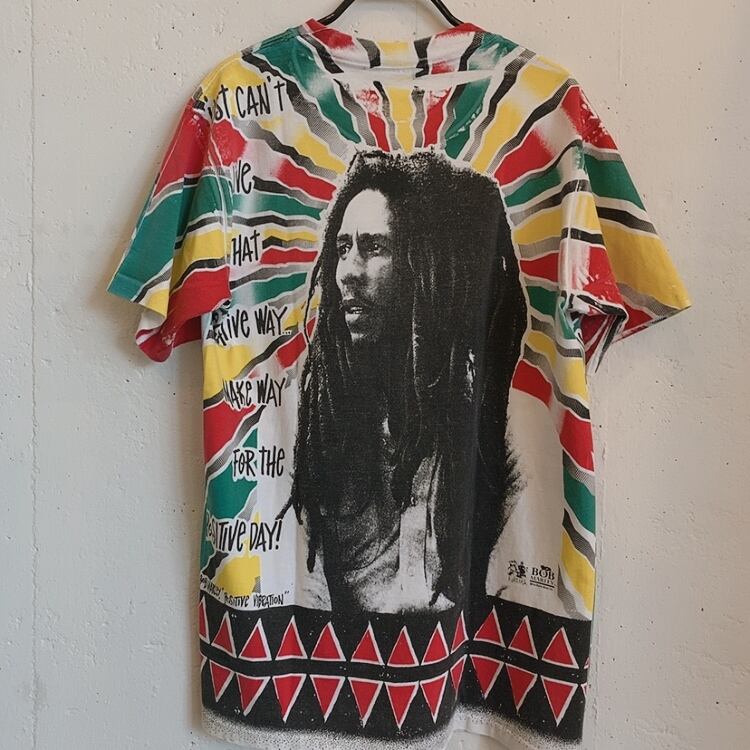 レゲエミュージシャン、ボブ・マーリーのラスタカラーの全面特大シルクスクリーンプリントヴィンテージTシャツです。1990年代貴重な1枚。