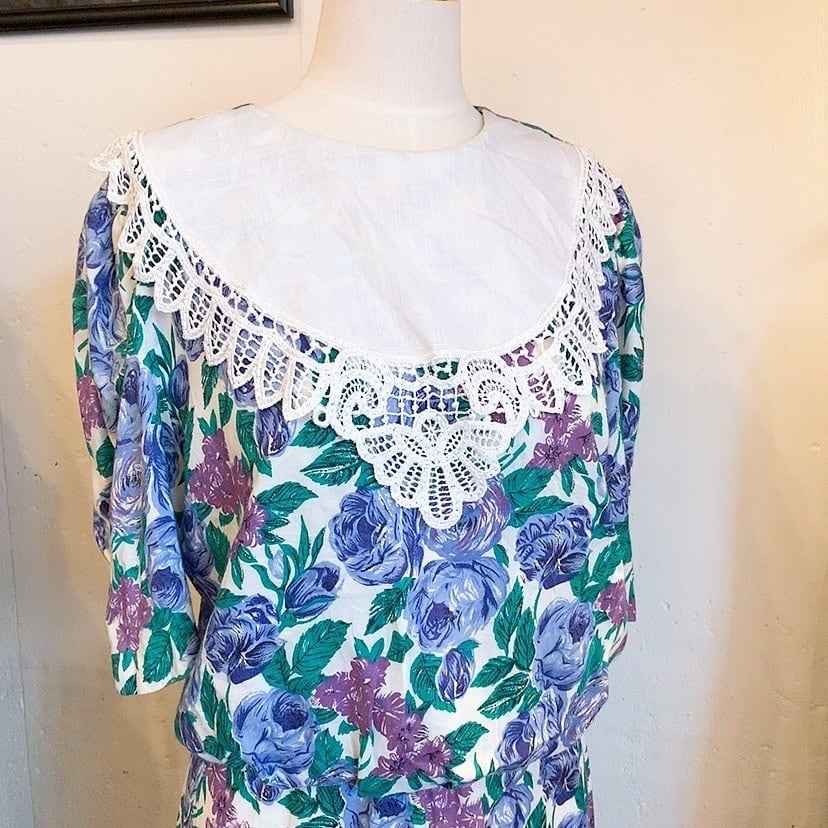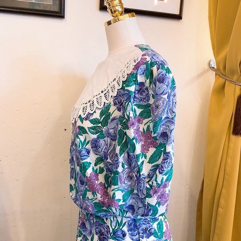 Made in USAヴィンテージワンピースです。1970年代の花柄ロングワンピース。首回りのレースが素敵です。